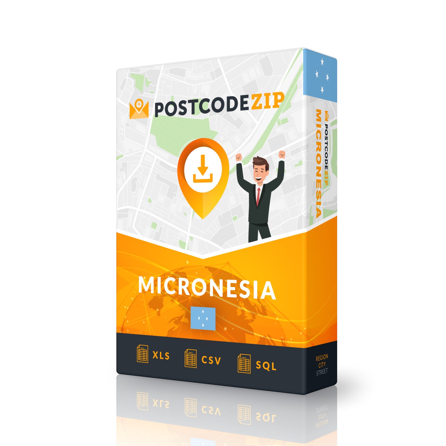 This product contains the complete list of all postal codes/cities in Micronesia. The file contains 0 postal codes, 0 cities across the entire country.