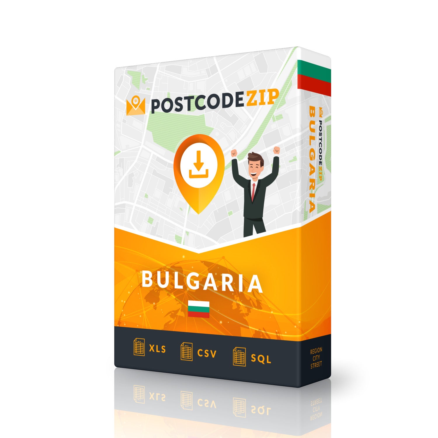 Este produto é um ficheiro descarregável em formato Excel, CSV ou SQL, que contém uma lista de todos os dados postais, cidades e ruas neste país. Os dados podem ser filtrados dentro do Excel e posteriormente organizados por cidades, vilas e regiões da Bulgária.