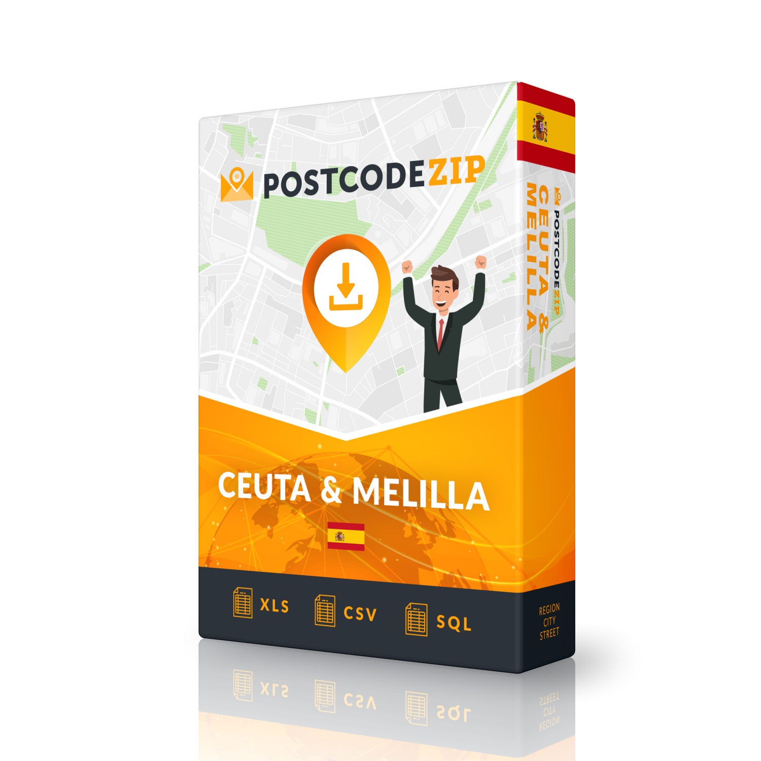 Este produto é um ficheiro descarregável em formato Excel, CSV ou SQL, que contém uma lista de todos os dados postais, cidades e ruas neste país. Os dados podem ser filtrados dentro do Excel e posteriormente organizados por cidades, vilas e regiões de Ceuta & Melilla.