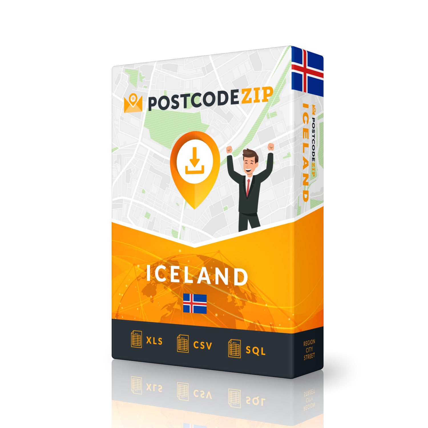 This product is a downloadable file in Excel, CSV or SQL format, containing a list of all postal codes, cities and streets in this country. The data can be filtered directly in Excel and then sorted by municipalities and regions of Iceland.