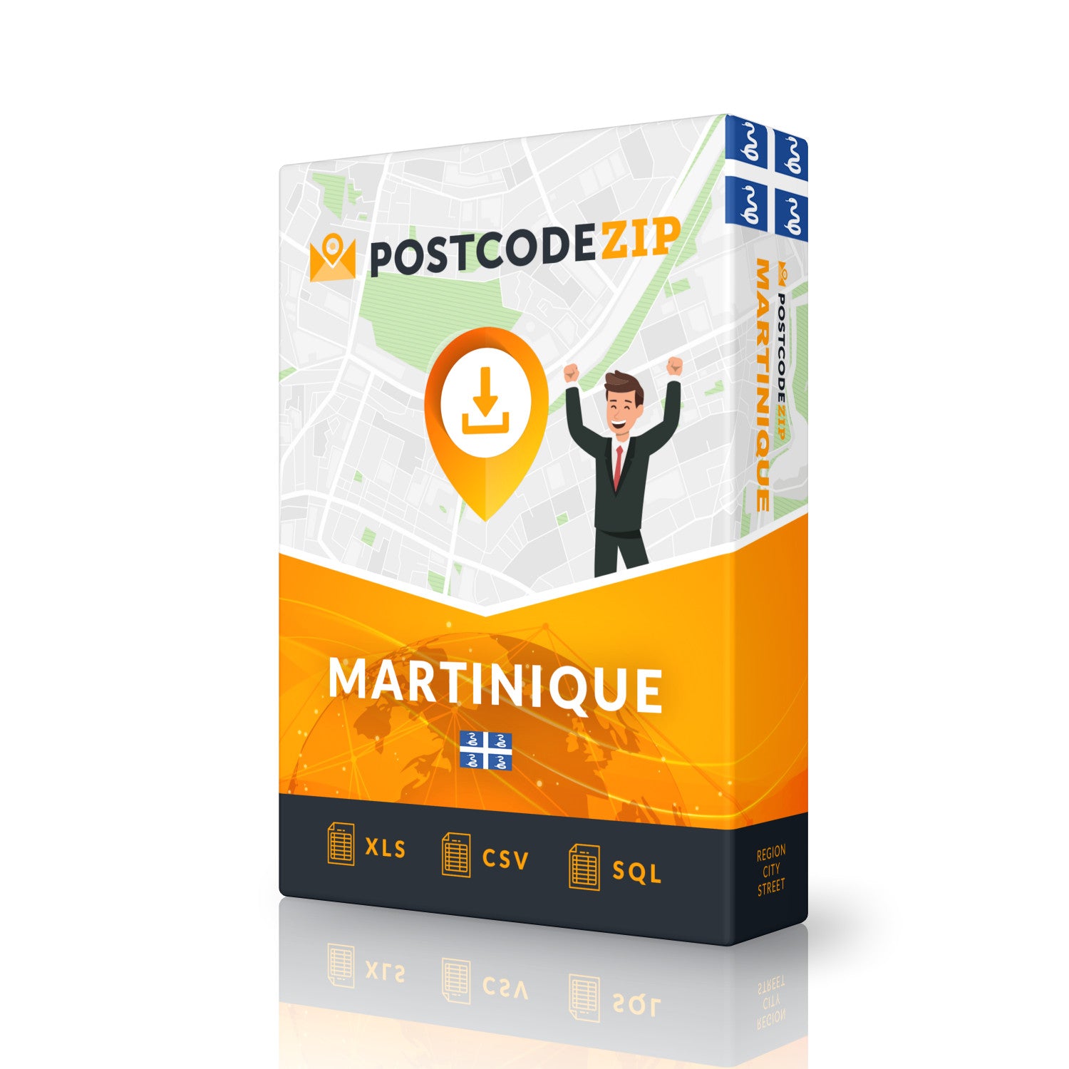 This product is a downloadable file in Excel, CSV or SQL format, containing a list of all postal codes, cities and streets in this country. The data can be filtered directly in Excel and then sorted by municipalities and regions of Martinique.