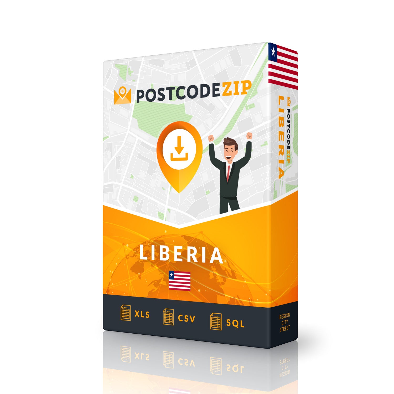 This product is a downloadable file in Excel, CSV or SQL format, containing a list of all postal codes, cities and streets in this country. The data can be filtered directly in Excel and then sorted by municipalities and regions of Liberia.